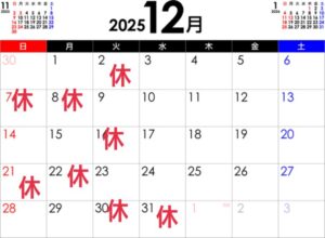 第二・第四・第五 火曜日をお休みしていますが、予定やカレンダーの都合によっては休みの週を入れ替える事もあります