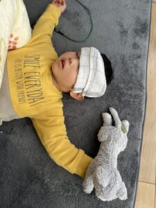 なぜだか布巾と、手に持っている祖母から貰ったぬいぐるみがお気に入りです