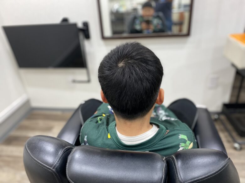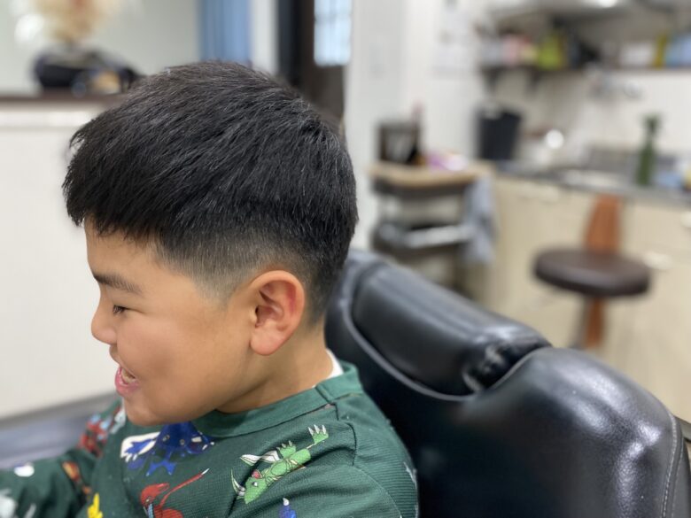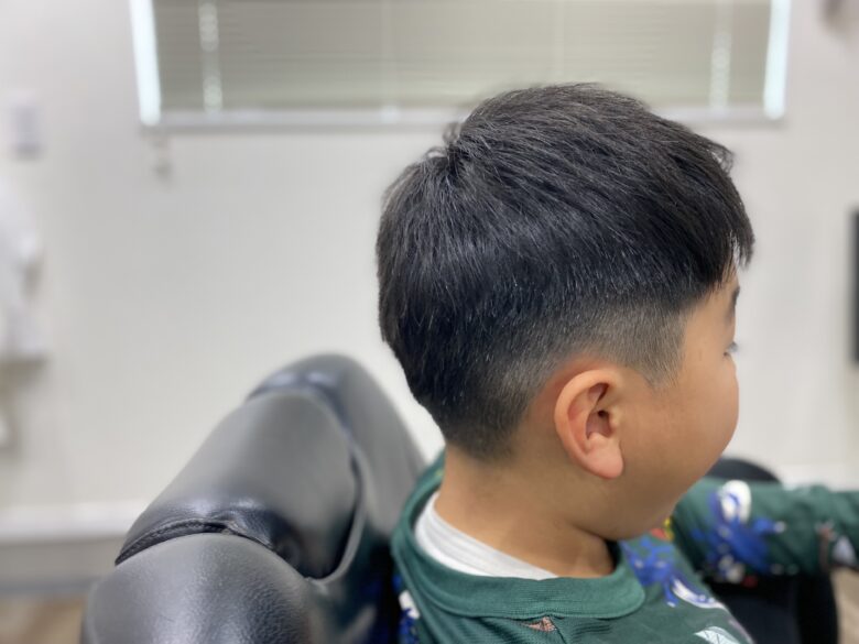 これを普通に刈り上げると息子の場合は横がすぐ広がってくるので、広がりを被さる髪でカバーできるツーブロックが相性◎です♬